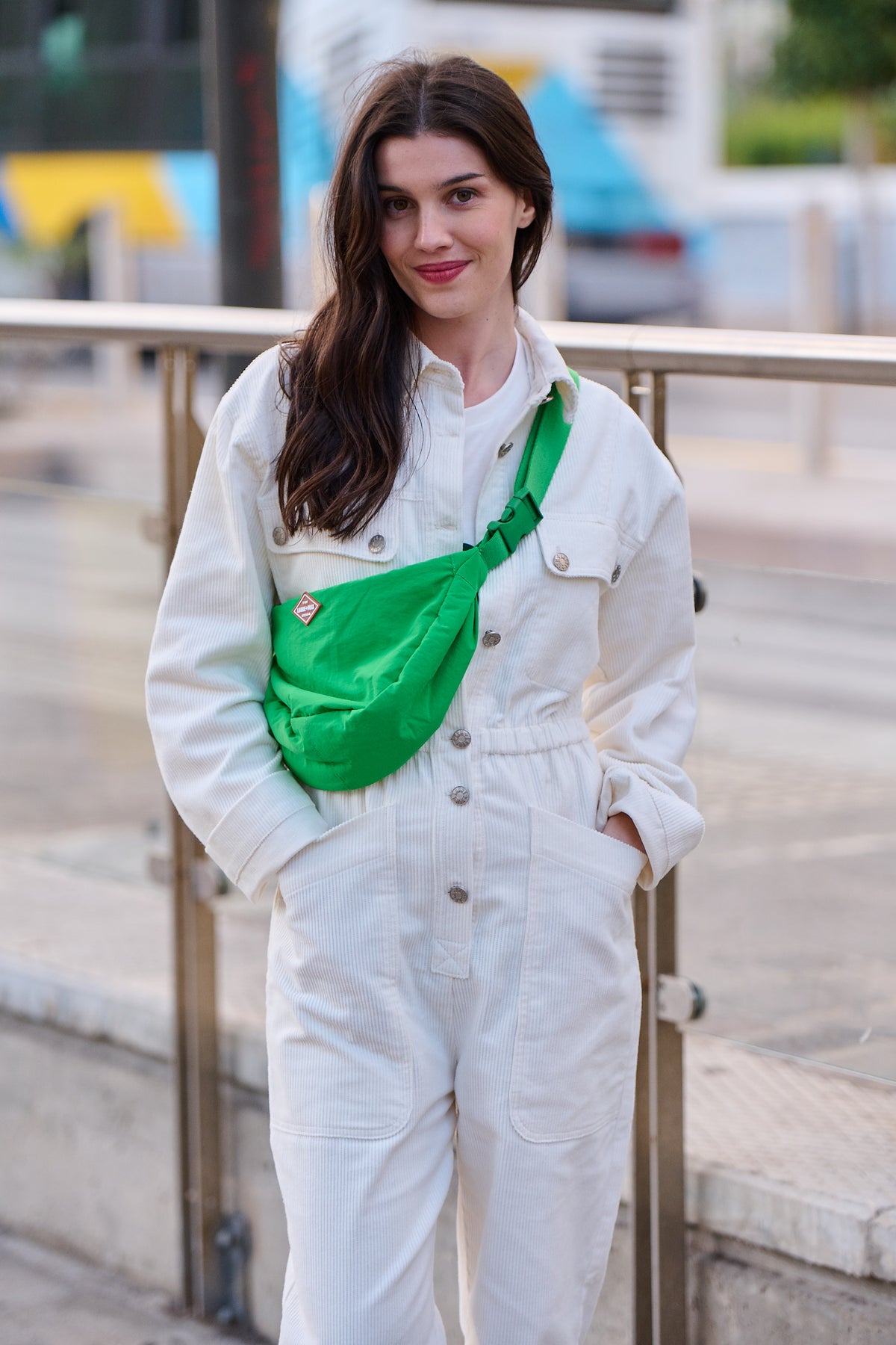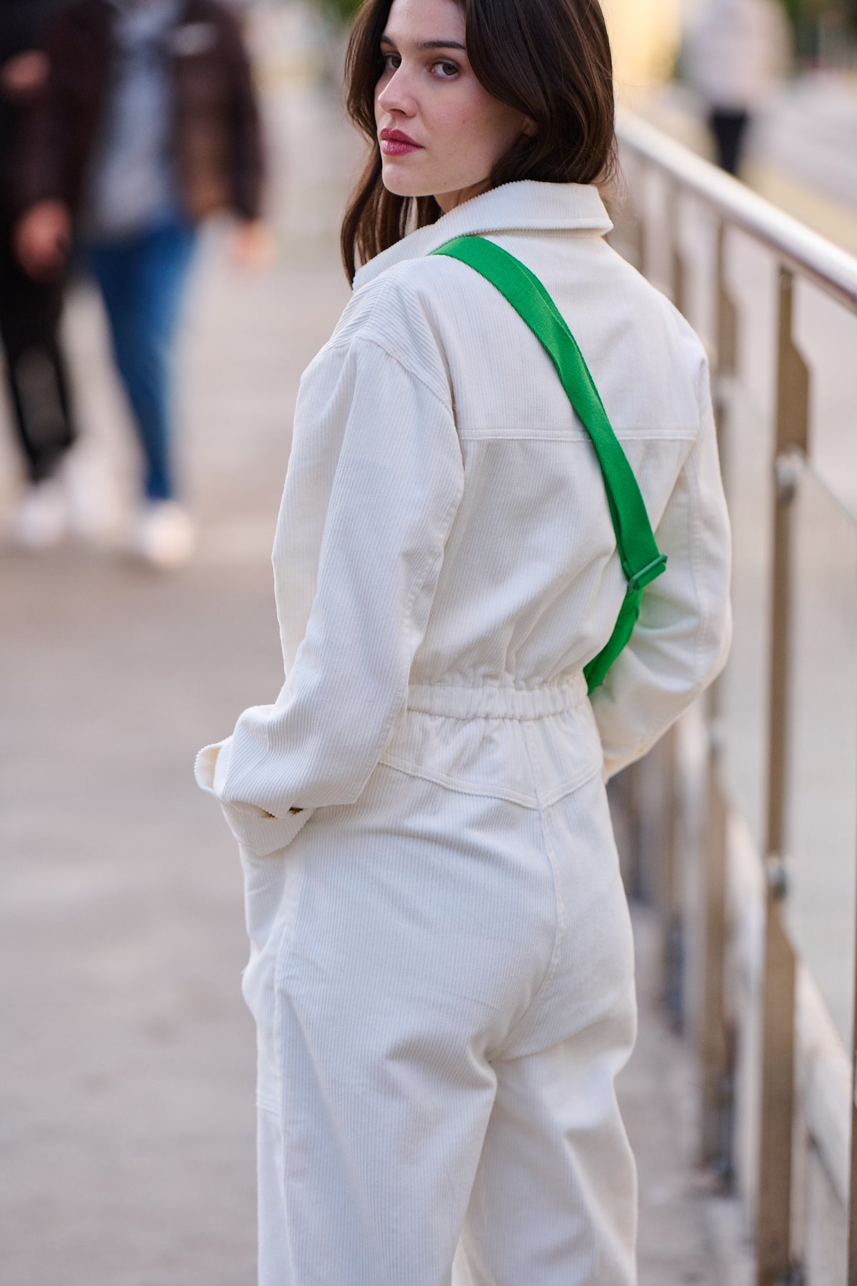 " La combinaison Opale, c'est la pièce forte de votre dressing, que ce soit en bleu marine, en vert ou en blanc cassé. Elle se fait toute douce avec son velours côtelé, mais aussi osée si vous la portez boutons ouverts, sous-pull en-dessous. "