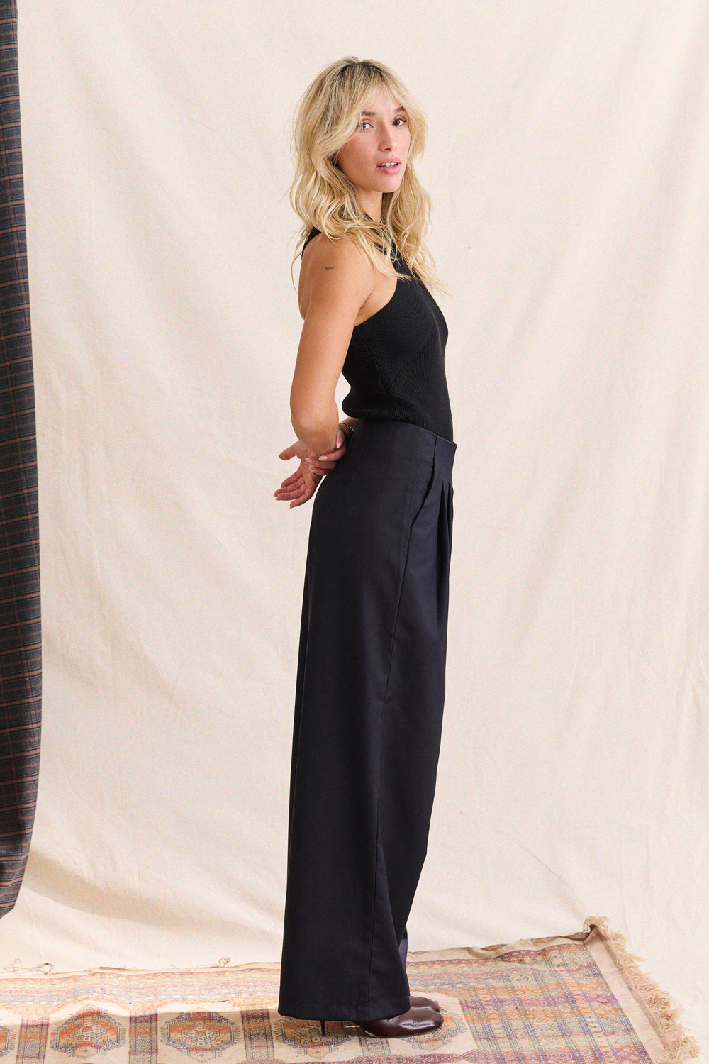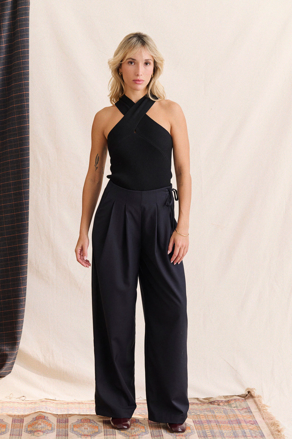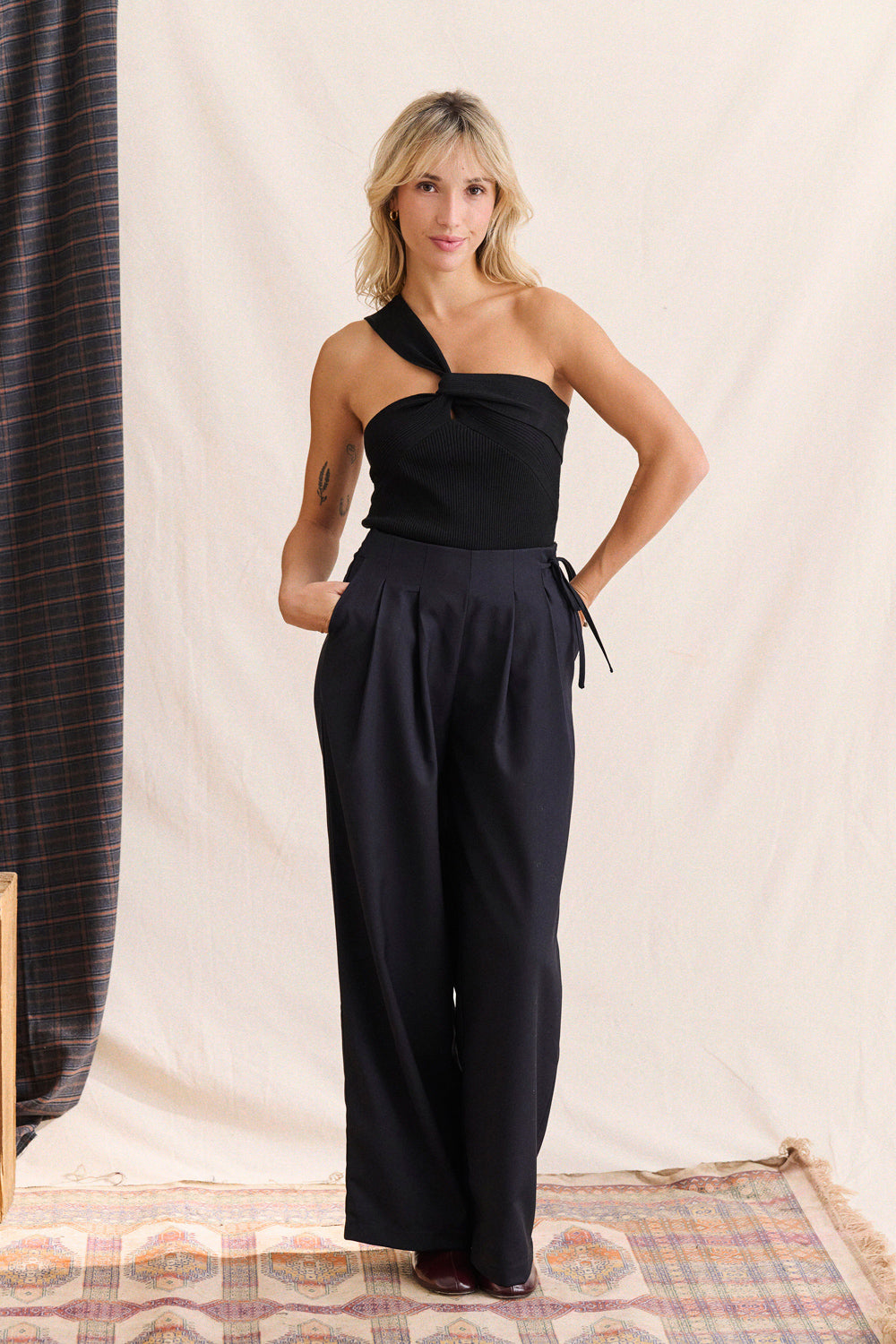Le pantalon noir qu’on attendait : coupe large, tombé fluide, et une allure assurée. Ses plis marqués structurent la silhouette, tandis que la taille haute affine et allonge la jambe. Confortable mais toujours impeccable, c’est la pièce facile qui passe partout.