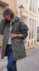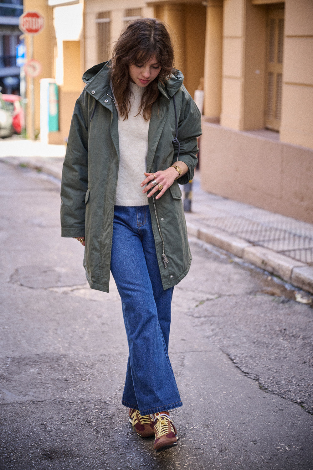 Majoritairement en coton, elle protège du vent tout en gardant un tombé souple. Entièrement doublée d’un motif à carreaux, elle cache un twist intérieur plein de caractère. Son col montant, sa capuche amovible et ses grandes poches à rabat en font une pièce aussi fonctionnelle qu’intemporelle. On la porte ouverte sur un jean et un pull, ou fermée jusqu’en haut quand le vent se lève, toujours avec la même allure assurée.