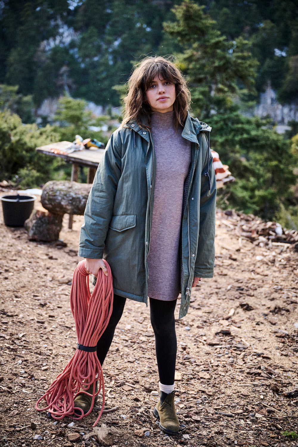 Sur les photos en ville Elena porte également le pull en mohair Marco sans manches, ainsi que le jean Percy en denim stone. À la montagne, elle porte la robe pull beige Rosalya sous sa parka.