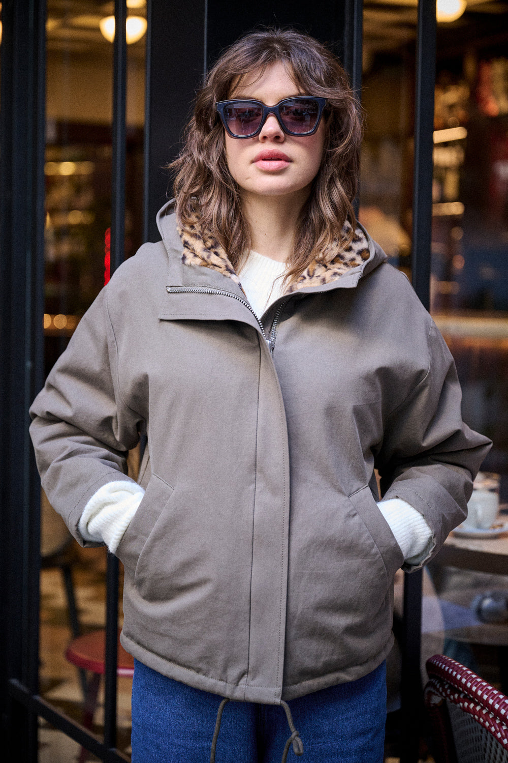 Et puis il y a ce détail qu’on aime tant : une doublure en fausse fourrure léopard, ultra douce qu’on a envie de porter à même la peau, jusque dans la capuche et les poches !