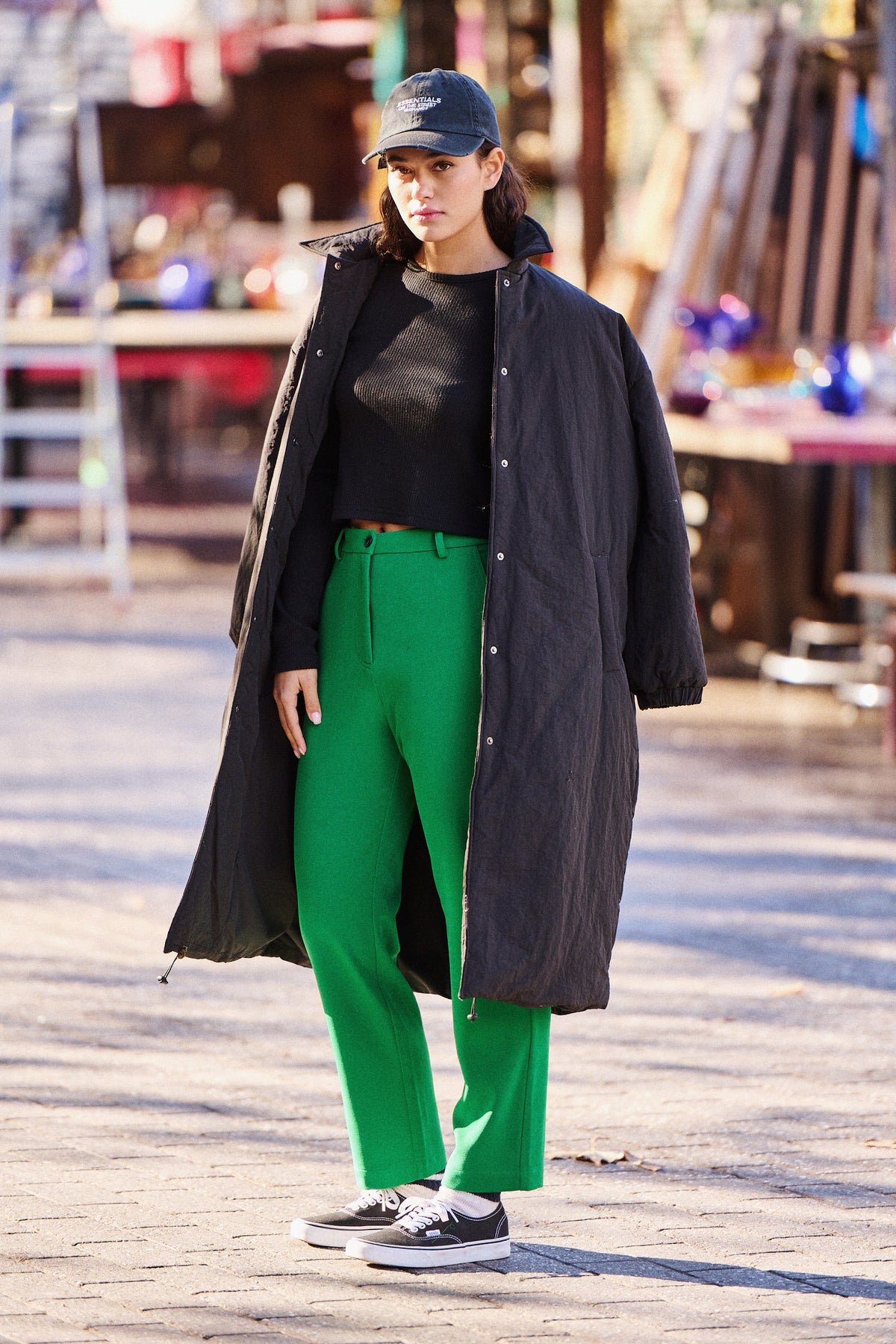 Daniela porte le t-shirt à manches longues Talia noir et le manteau long Gino noir.