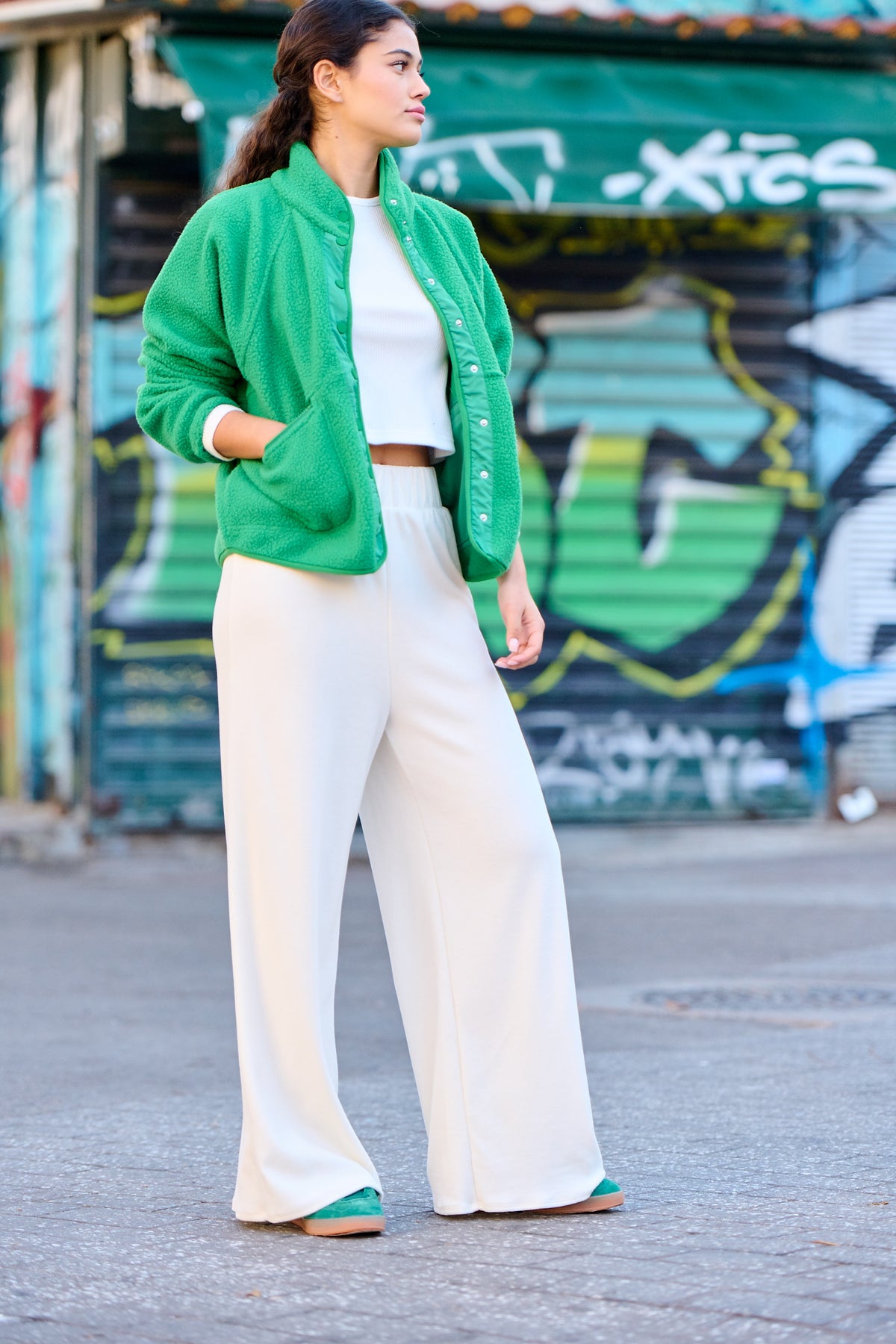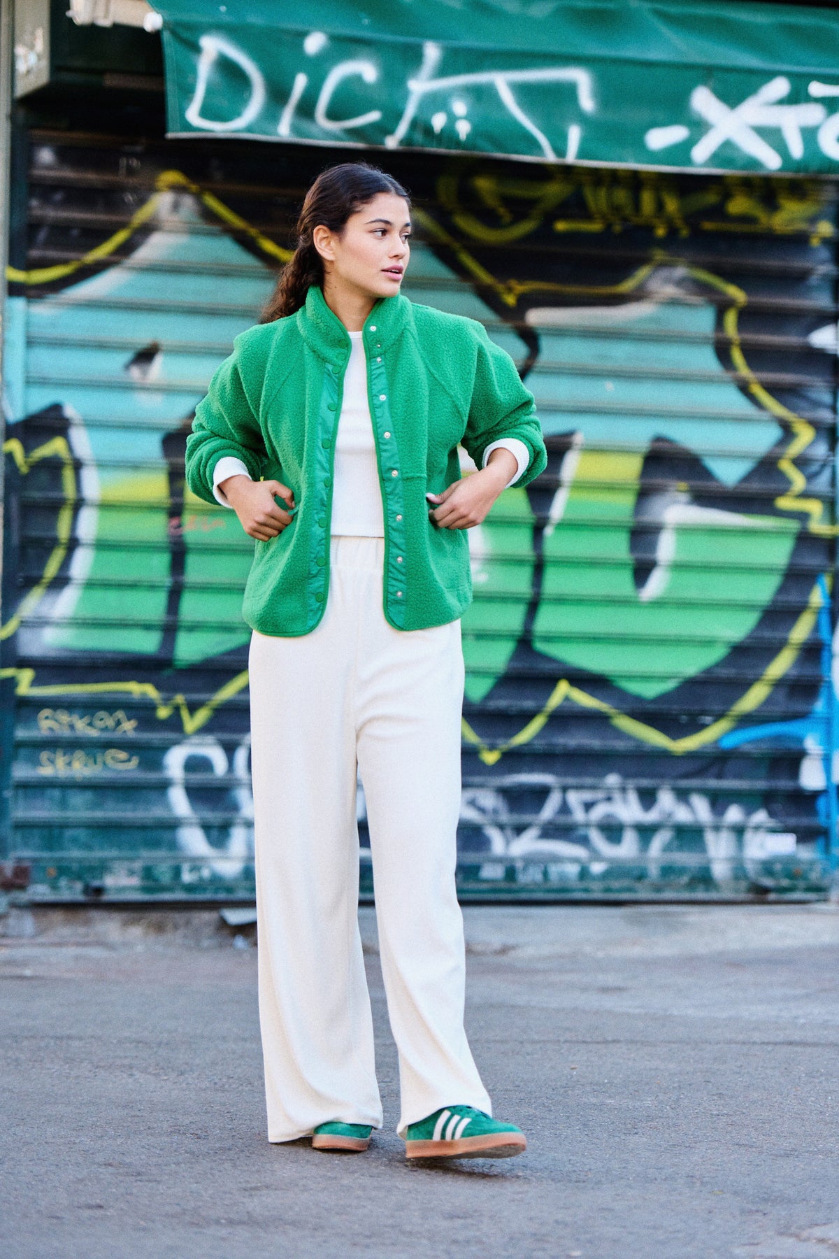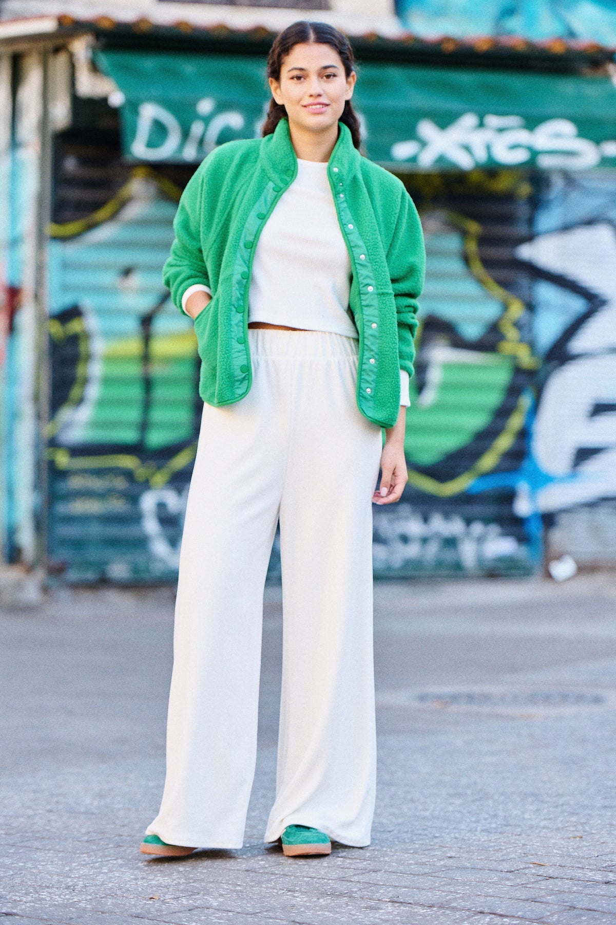 Elle porte le t-shirt à manches longues Talia blanc cassé et la veste polaire Giany verte flash.