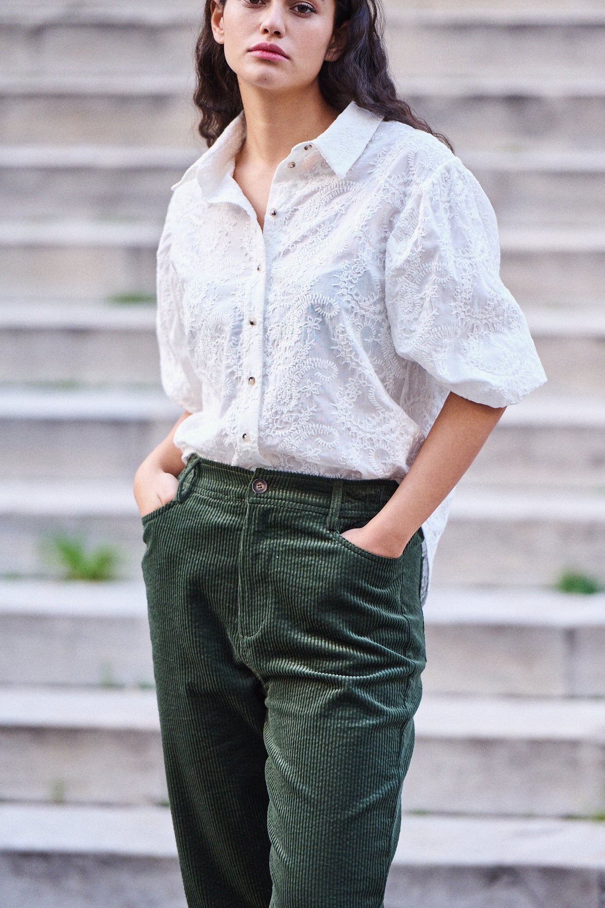 Elle porte la chemise brodée Catane blanche et le pull Maddox kaki