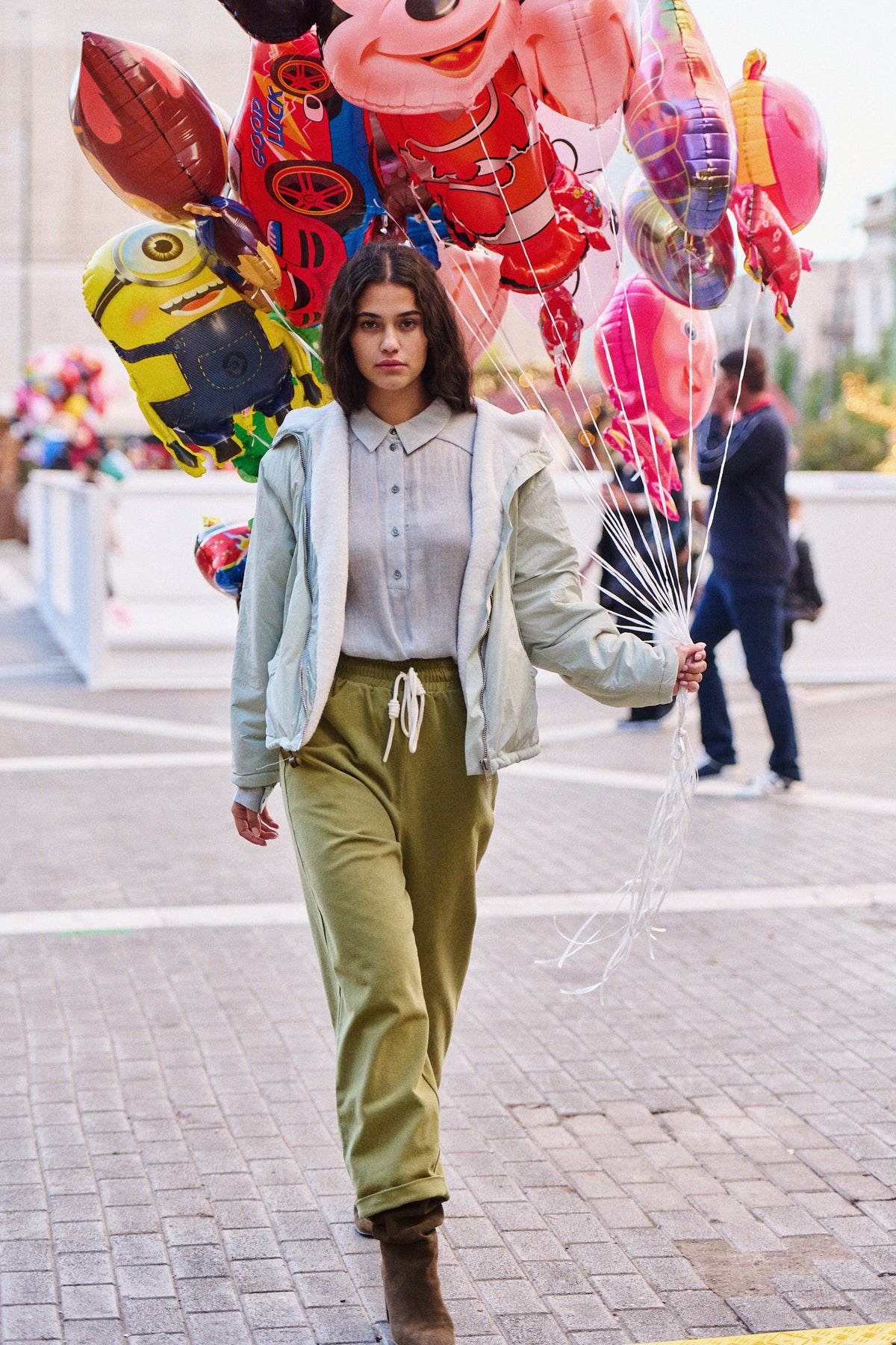 Elle porte la chemise Cassy gris chiné et la parka Guzmania vert d'eau
