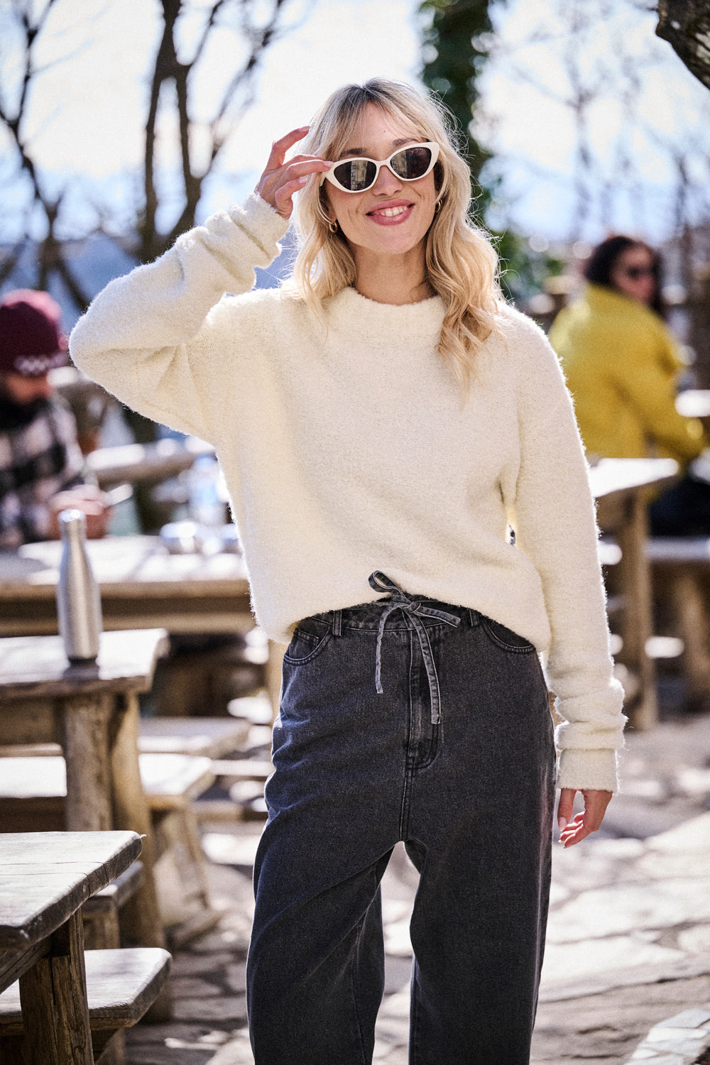 Avec sa maille bouclée, il a ce relief irrégulier qui le rend vivant et hyper agréable au toucher. Sa coupe droite, son col rond et ses manches amples en font un essentiel facile, qui se porte sur un jean ou une jupe sans se poser de question.