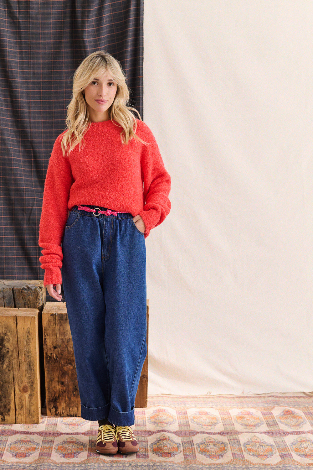 Avec sa maille bouclée, il a ce relief irrégulier qui le rend vivant et hyper agréable au toucher. Sa coupe droite, son col rond et ses manches amples en font un essentiel facile, qui se porte sur un jean ou une jupe sans se poser de question.