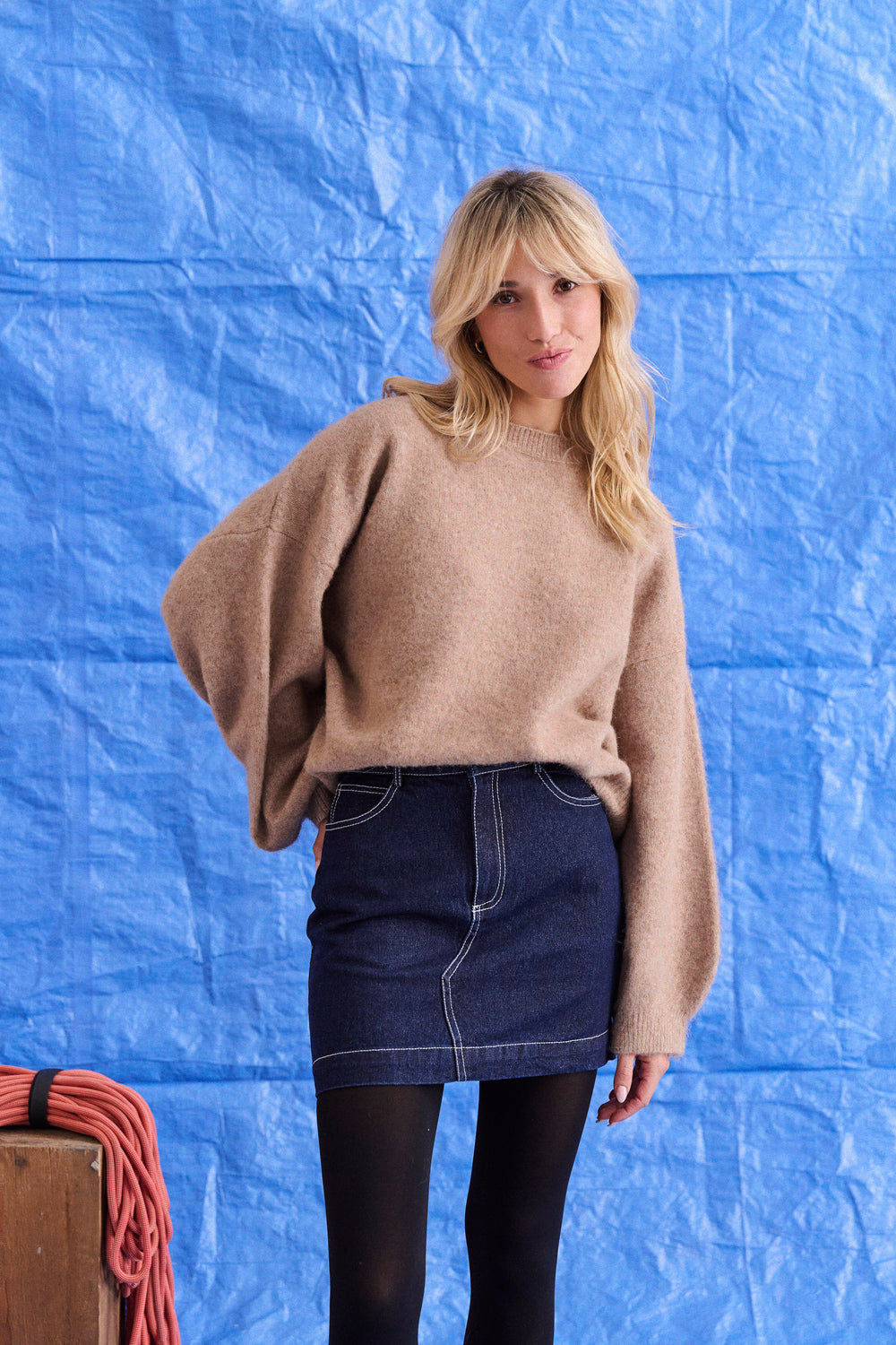 Laure a opté pour une maille plus resserrée au col, aux poignets et sur le bas, un contraste discret qui encadre le volume du pull et met la silhouette en valeur.