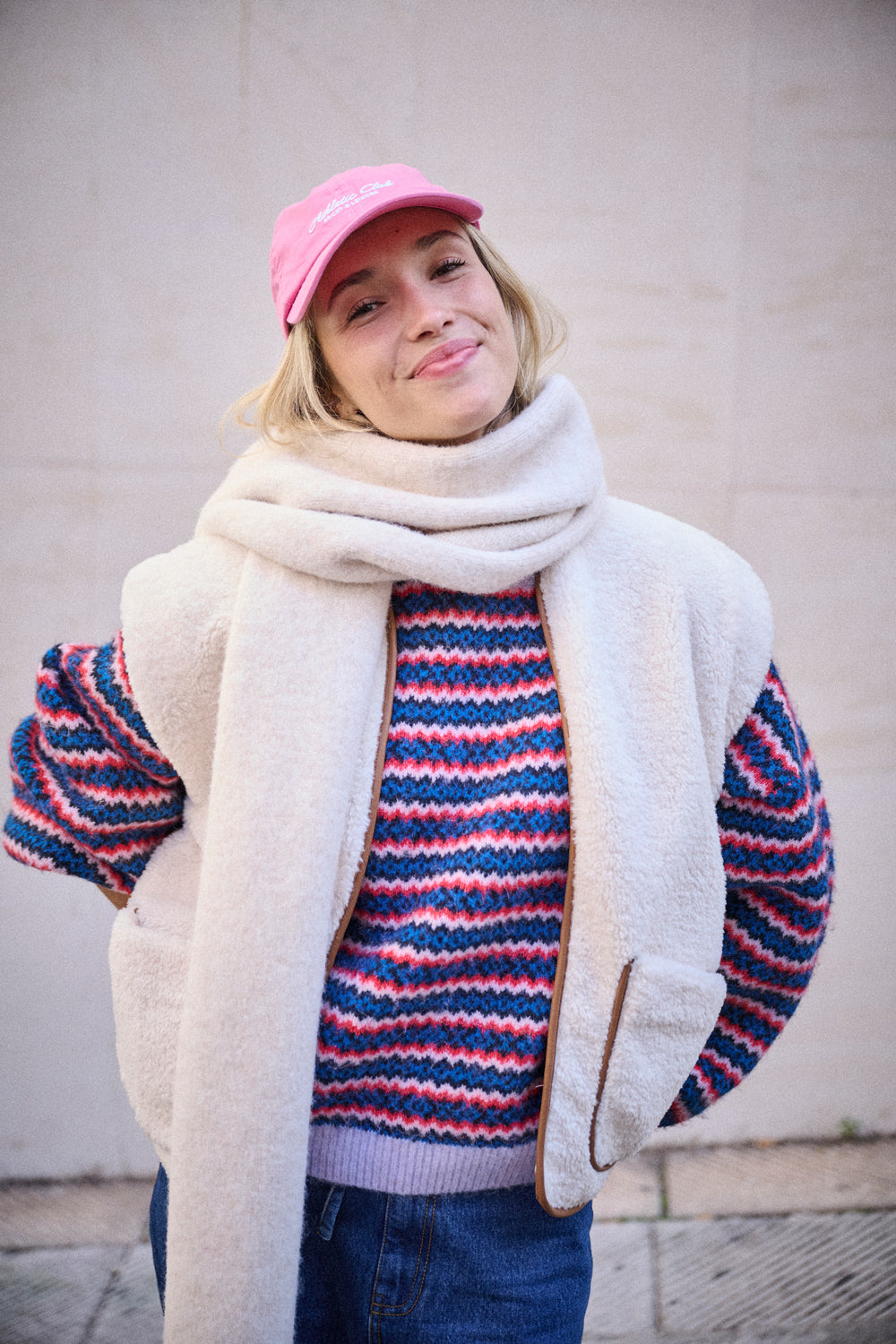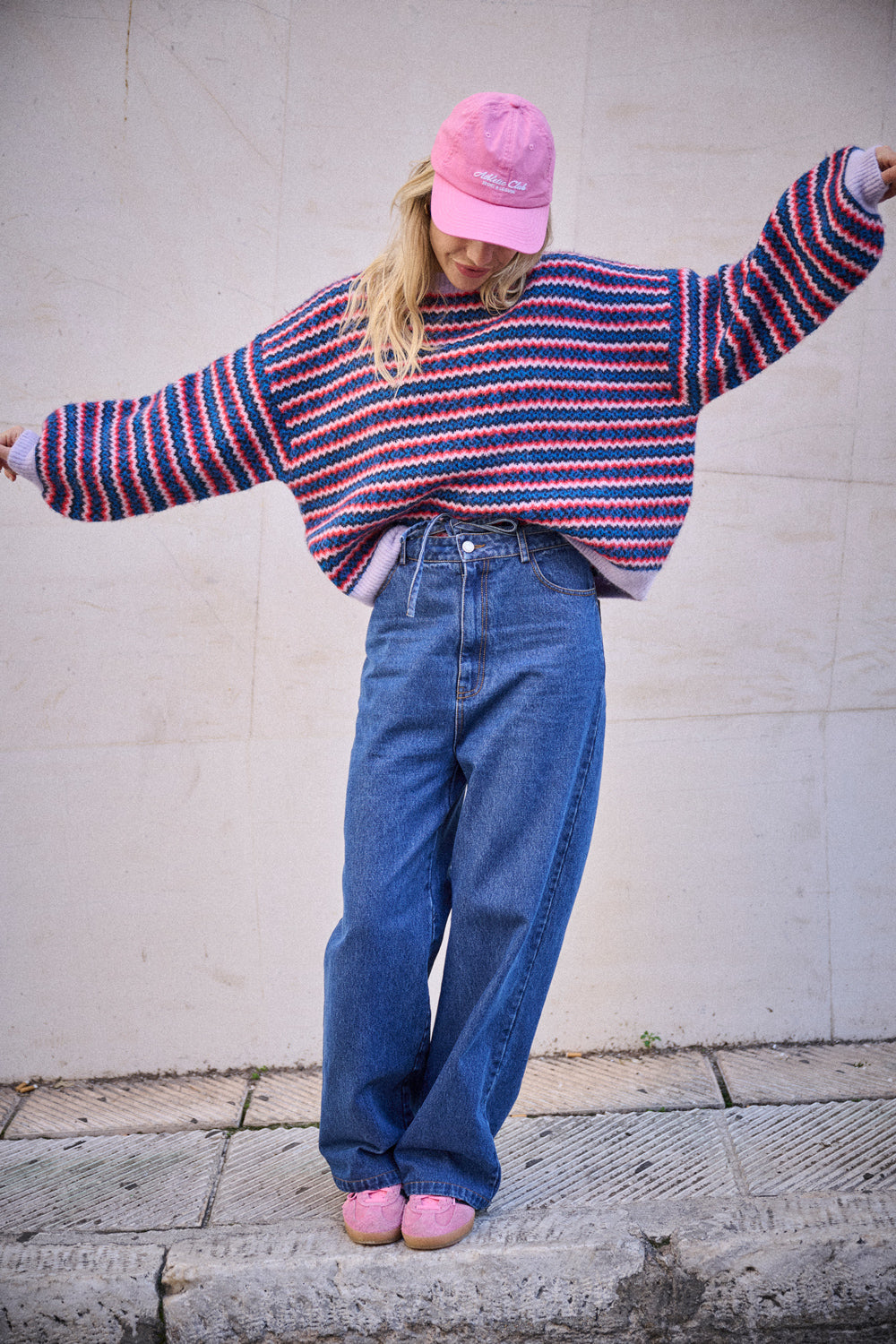 Avec ses manches amples et son volume généreux, il a ce côté cool qu’on adore. Les rayures colorées, entre bleu, rouge et lilas, apportent de l’énergie et réchauffent instantanément la silhouette.