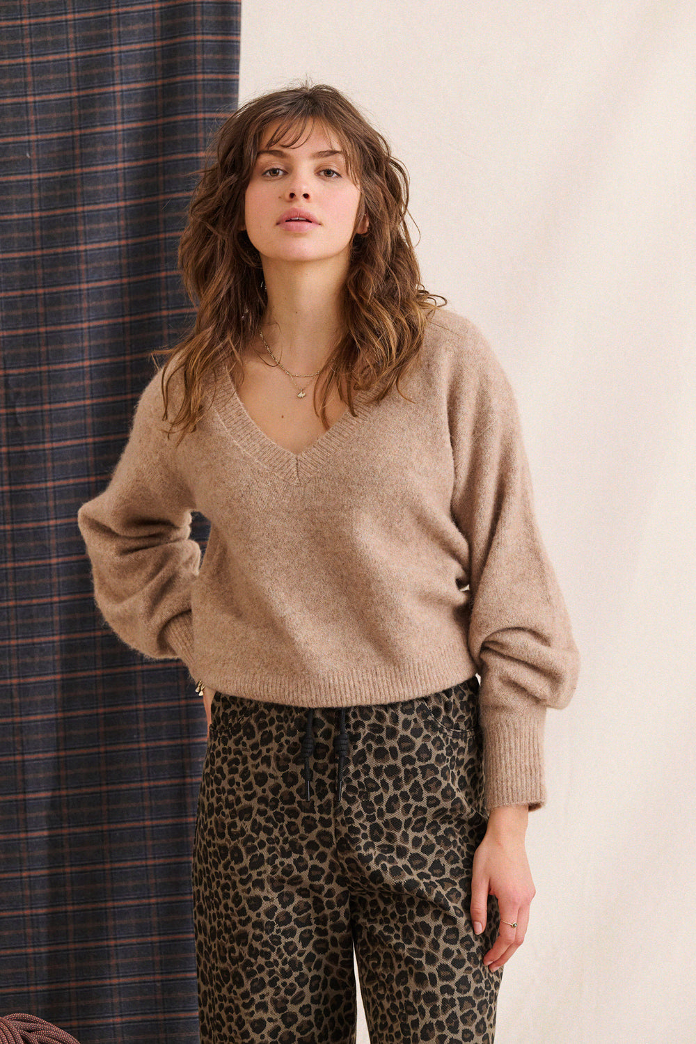 Laure a opté pour une maille plus resserrée au col, aux poignets et sur le bas, un contraste discret qui encadre le volume du pull et met la silhouette en valeur.