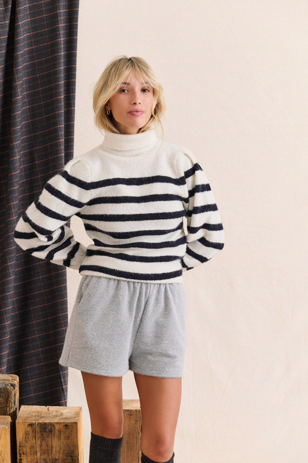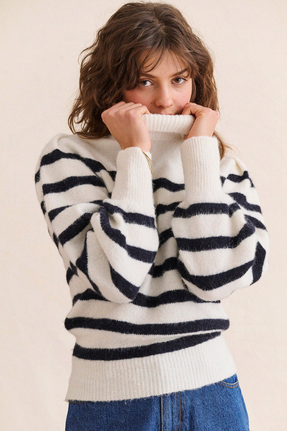 Avec son col roulé enveloppant, ses manches légèrement amples et sa maille douce, il réchauffe sans perdre son allure. Les rayures marine sur fond écru lui donnent un côté graphique et intemporel, facile à associer à un jean brut comme à une jupe.