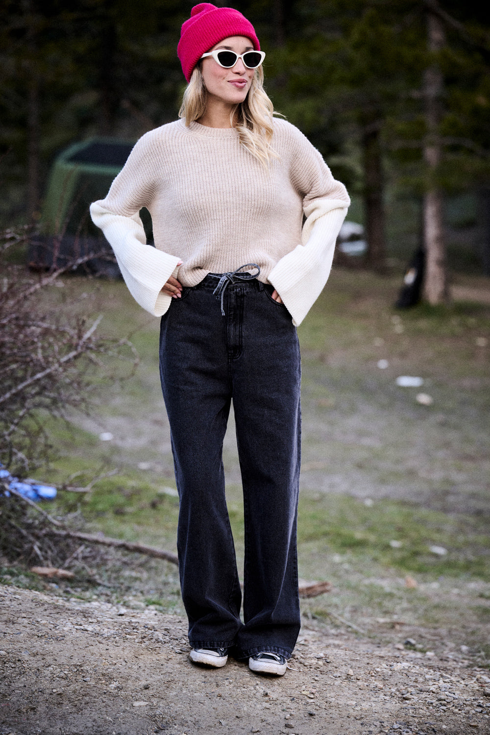 Coupe loose, épaules tombantes et manches longues légèrement évasées pour une allure décontractée. Sa particularité ? Un jeu subtil de trois nuances de beige, du plus clair au plus soutenu, qui apporte du relief.