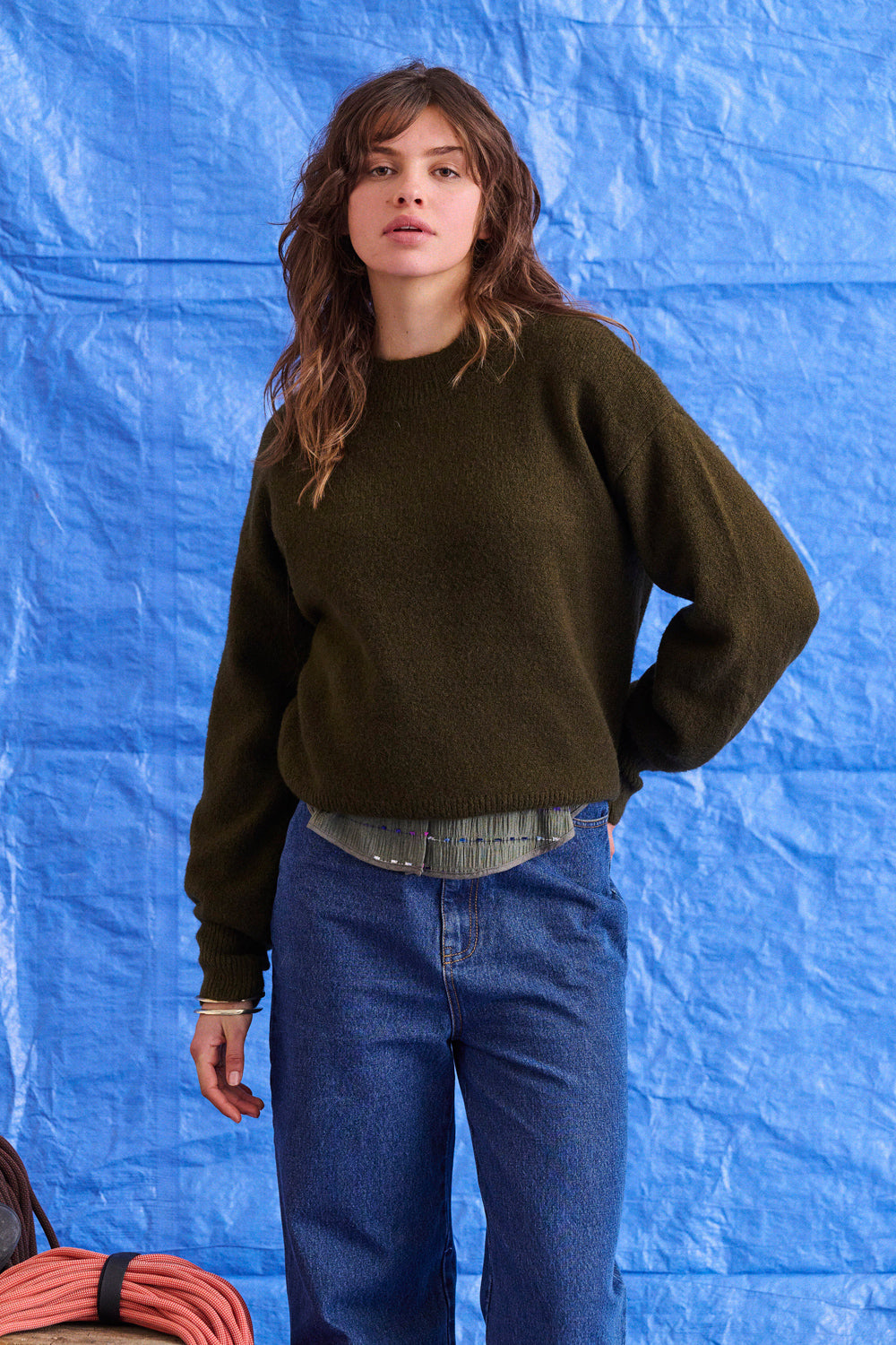 Avec sa coupe droite et son col rond légèrement montant, c’est le genre de pièce qu’on enfile sans se poser de questions. Sa maille douce et ses manches amples apportent du confort et un tombé fluide.