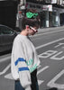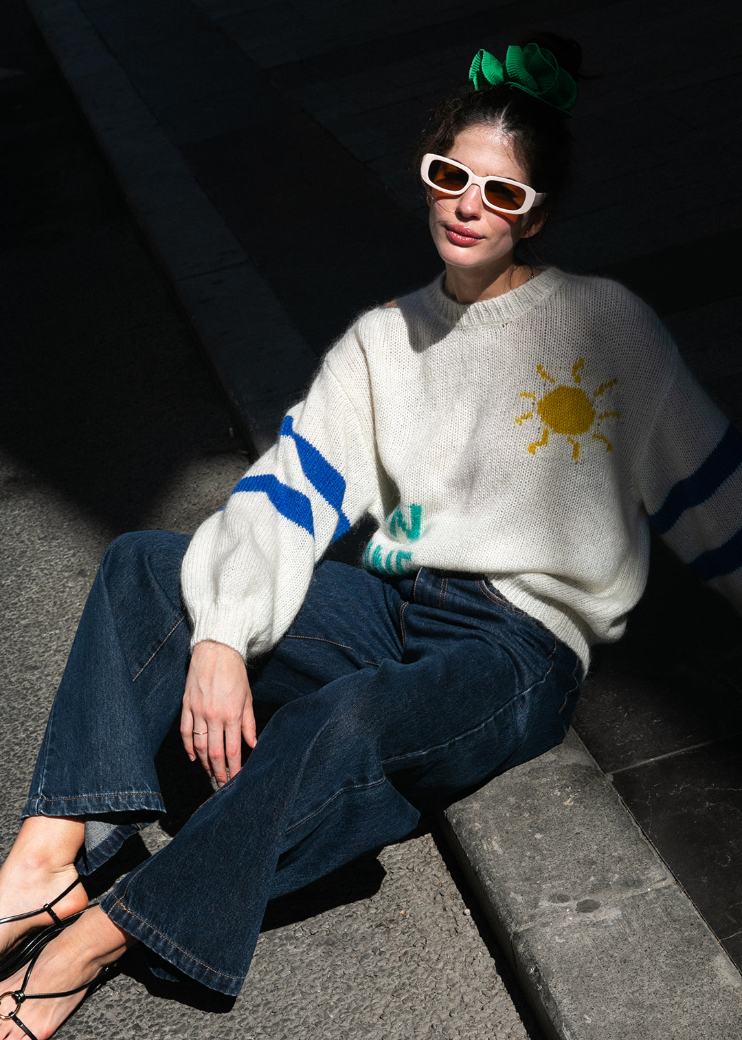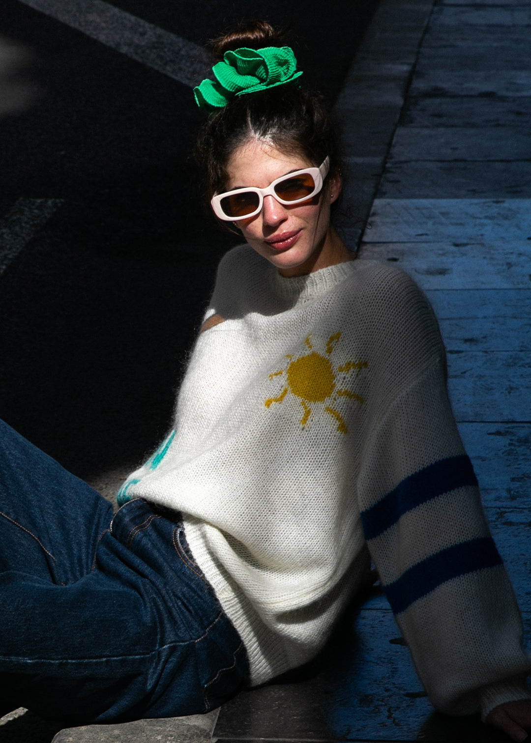 Une maille duveteuse, douce sur la peau, une coupe large et confortable, et un motif tricoté qui fait sourire : un soleil jaune à gauche, deux bandes bleues sur les manches, et un mot qui résume tout : SUNSHINE.