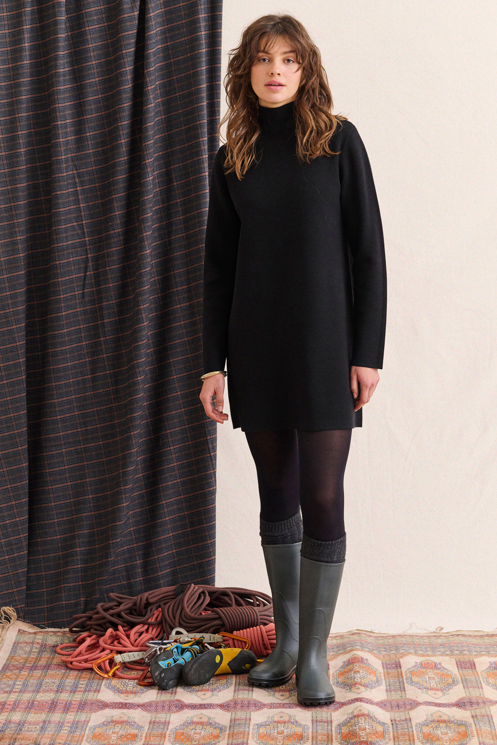 Sa texture compacte lui donne un tombé net et une allure structurée. Avec son col montant et sa coupe droite légèrement évasée, elle se porte seule avec des collants opaques et une paire de boots ou de talons.
