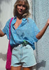 Laure a choisi de laisser la finition du short accru donc légèrement effiloché. Un détail simple qui lui donne ce côté un peu vintage, comme un short en jean qu’on aurait depuis toujours.