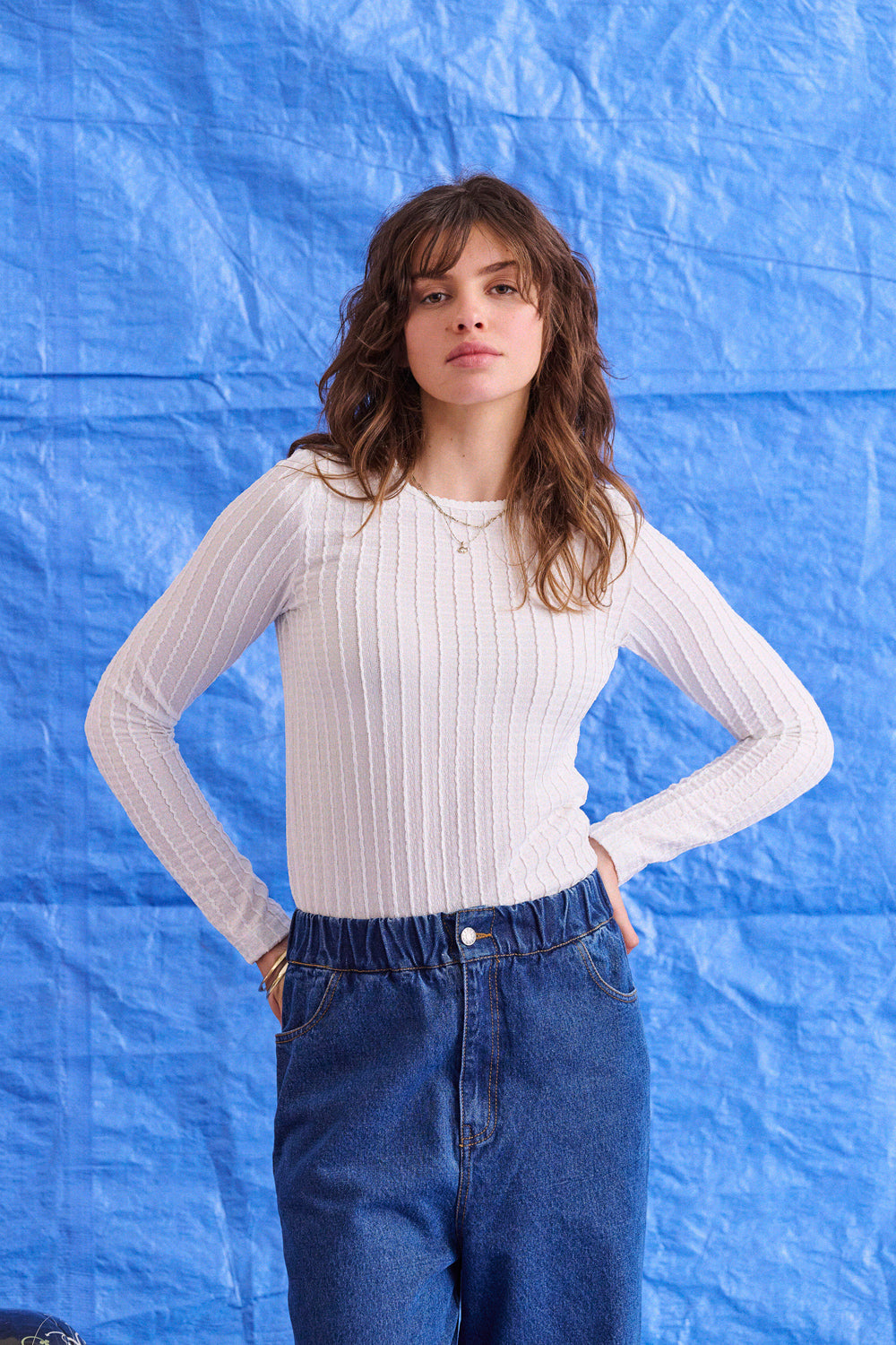 Coupe droite, manches longues, encolure ronde : une base simple, facile à porter au quotidien. La matière apporte juste ce qu’il faut de relief pour sortir du basique trop lisse, c’est le genre de pièce qui devient un essentiel de votre garde robe.