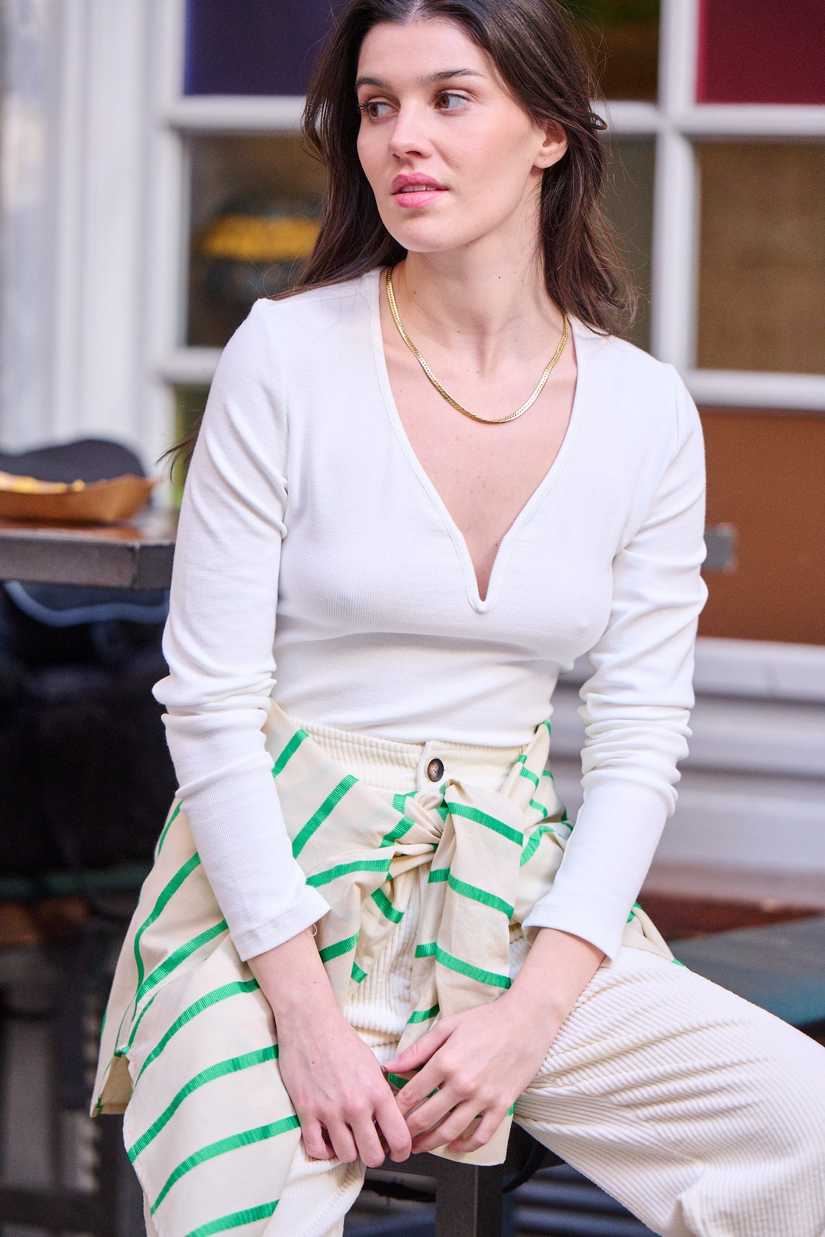 Elle porte le pantalon en velours côtelé Pino écru et la chemise rayé Contis verte et blanche