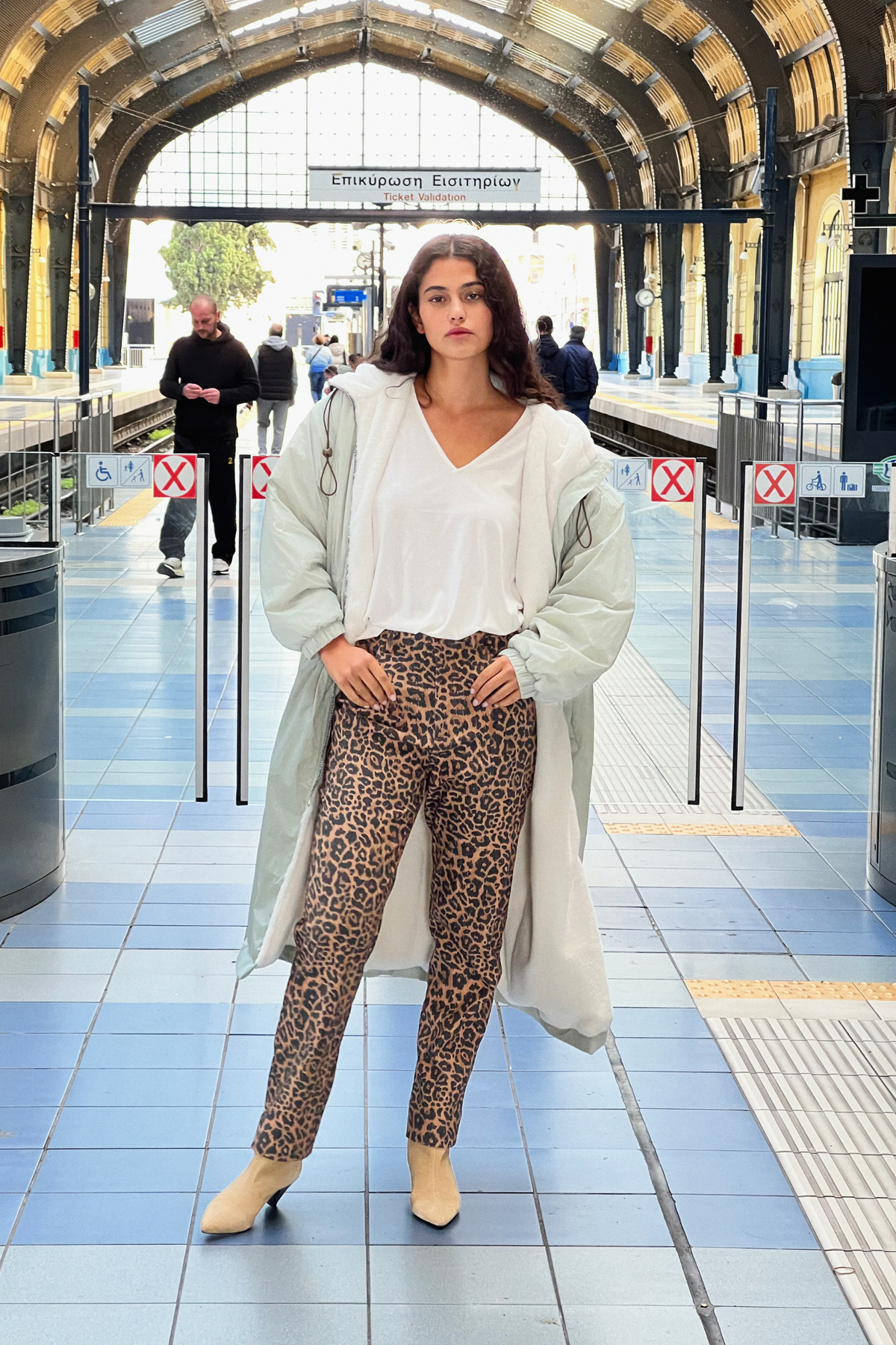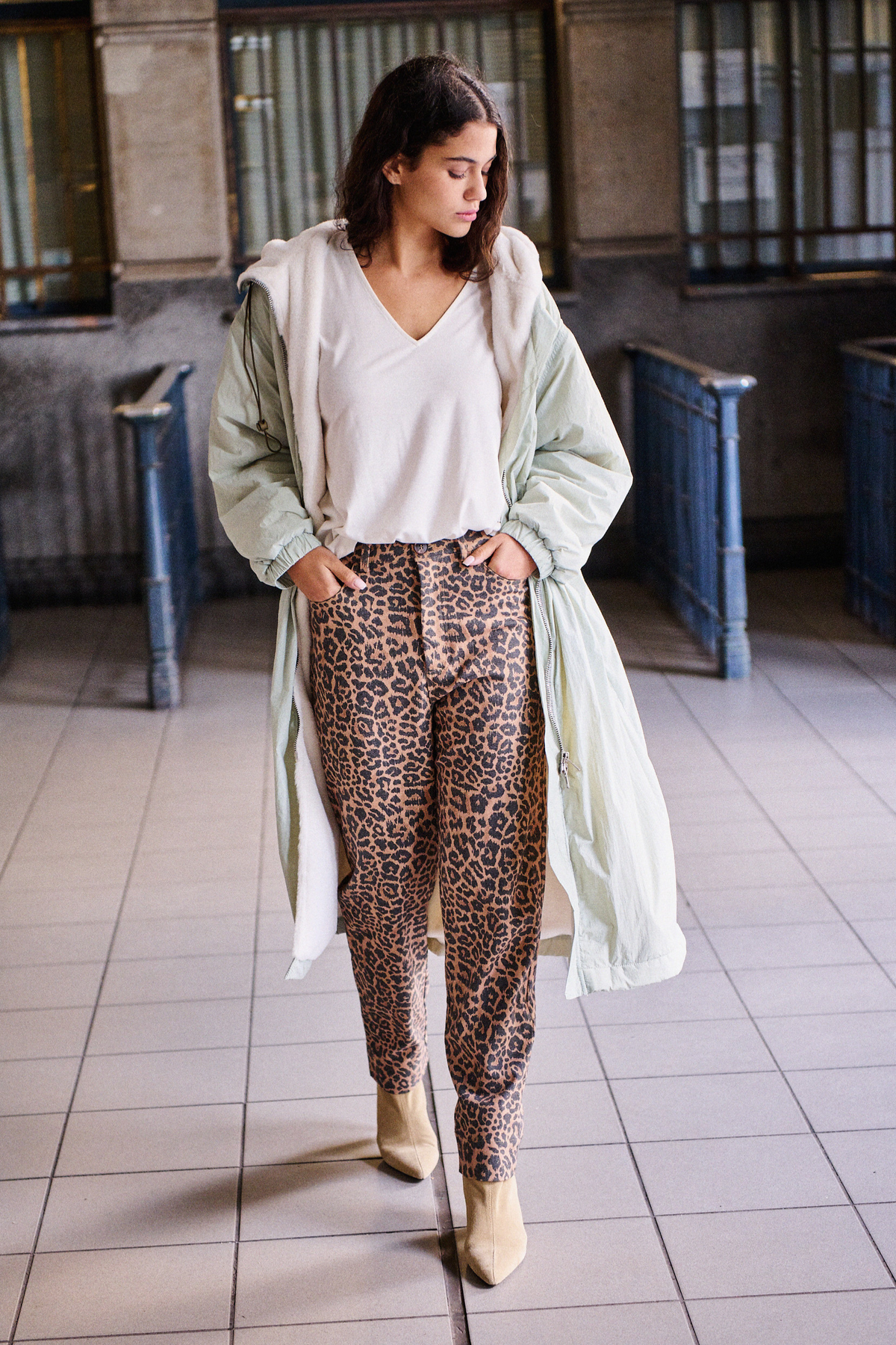 Elle porte la parka longue Gilen vert d'eau et le pantalon Paciflor imprimé léopard.