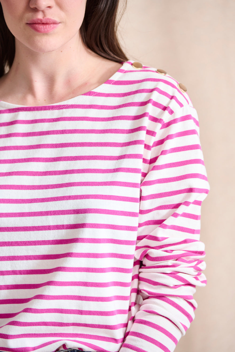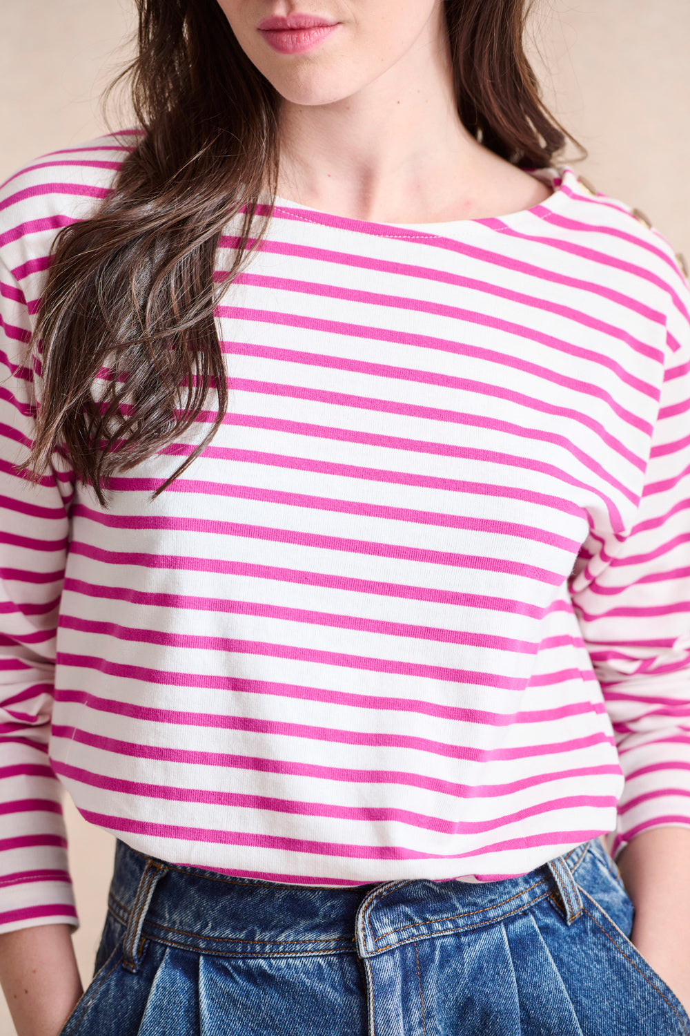 " L’indispensable revisité ! La marinière qu’on aime toutes, twistée avec des boutons fantaisie. Elle devient iconique ! À porter avec toute sa garde-robe !"