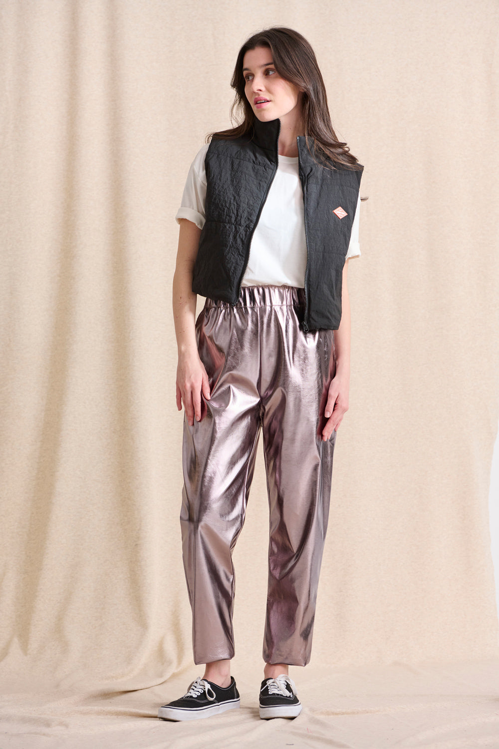 Sur les photos, Lara porte également le pantalon Perry rose et la doudoune sans manche Greg noire.