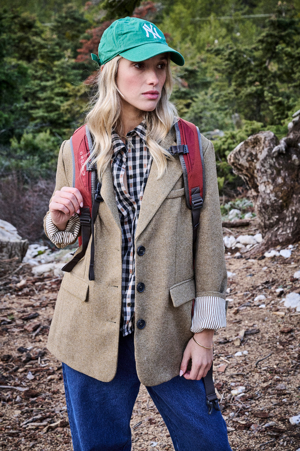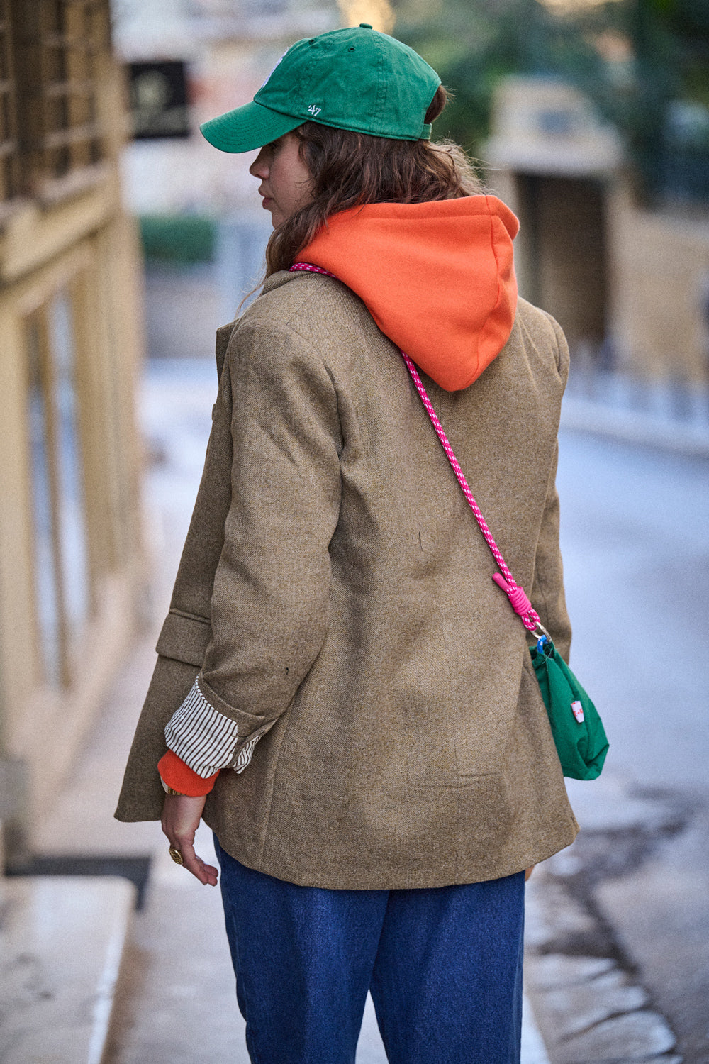 Sa coupe tailleur, dessinée avec justesse, apporte une allure assurée sans jamais faire trop habillée. Entièrement doublé d’un motif rayé qu’on devine à chaque mouvement, il joue entre codes classiques et esprit cool. On le porte sur un hoodie, un jean ou une chemise blanche : tout marche, et c’est ça qu’on aime.