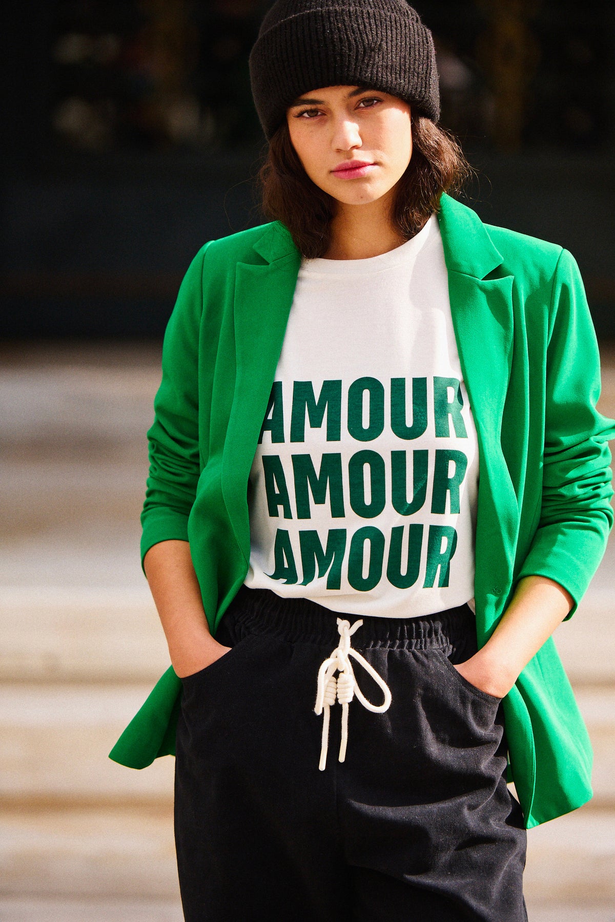 Elle porte le t-shirt imprimé "amour" Trey blanc, le pantalon Primo noir et le bonnet Alessi noir.